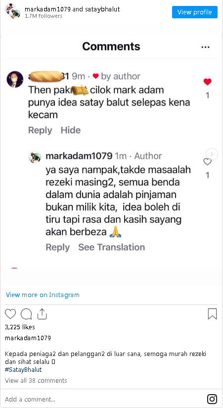 Pelakon dan penyanyi Mark Adam tampil memberi respon setelah idea perniagaan Sate Bhalut miliknya didakwa telah ‘diciplak’ restoran makanan ‘western’ terkemuka.